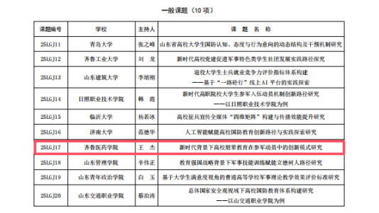鲁网10月13日讯近日,2025年山东省学校国防教育工作研究课题立项名单公布,齐鲁医药学院王杰老师主持申报的《新时代背景下高校朋辈教育在参军动员中的创新模式研究》获批立项。